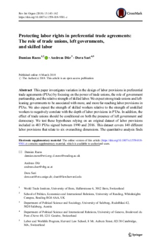 This paper investigates variation in the design of labor provisions in preferential trade agreements (PTAs) by focusing on the power of trade unions, the role of government partisanship, and the relative strength of skilled labor. We expect strong trade unions and left-leaning governments to be associated with more, and more far-reaching labor provisions in PTAs. We also expect the strength of skilled workers relative to the strength of unskilled workers to negatively correlate with the depth of labor provisions in PTAs. In addition, the effect of trade unions should be conditional on both the presence of left government and democracy. We test these hypotheses relying on an original dataset of labor provisions included in 483 PTAs signed between 1990 and 2016. This dataset covers 140 different labor provisions that relate to six overarching dimensions. The quantitative analysis finds support for the expectations concerning the influence of trade unions and the role of a country’s skill profile.