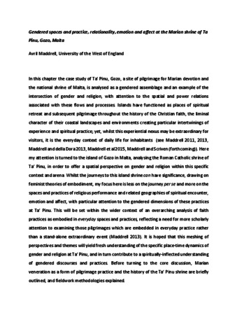 Gendered spaces and practice,relationality, emotion and affect at the Marian shrine of Ta Pinu, Gozo, Malta.