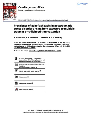 MacDonald, B., Salomons, T. V., Meteyard, L. and Whalley, M. G. (2018) Prevalence of pain flashbacks in post-traumatic stress disorder arising from exposure to multiple traumas or childhood traumatization. Canadian Journal of Pain, 2 (1). pp. 48-56. ISSN 2474-0527 doi: 10.1080/24740527.2018.1435994