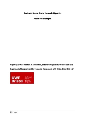 Maddrell, A. orcid id iconORCID: https://orcid.org/0000-0003-2941-498X, Ricci, M., Wigley, E. and Casado-Diaz, M., (2016) Review of recent Bristol economic migrants: needs and strategies. Report. UWE, Bristol. (Unpublished)