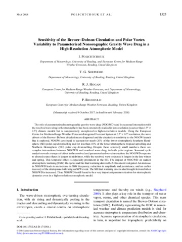 Polichtchouk, I., Shepherd, T. G. orcid id iconORCID: https://orcid.org/0000-0002-6631-9968, Hogan, R. J. orcid id iconORCID: https://orcid.org/0000-0002-3180-5157 and Bechtold, P. (2018) Sensitivity of the Brewer-Dobson circulation and polar vortex variability to parameterized nonorographic gravity wave drag in a high-resolution atmospheric model. Journal of the Atmospheric Sciences, 75 (5). pp. 1525-1543. ISSN 1520-0469 doi: 10.1175/jas-d-17-0304.1