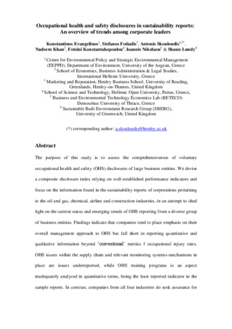 Evangelinos, K., Fotiadis, S., Skouloudis, A., Khan, N. orcid id iconORCID: https://orcid.org/0000-0001-6911-9737, Konstantakopoulou, F., Nikolaou, I. and Lundy, S. (2018) Occupational health and safety disclosures in sustainability reports: an overview of trends among corporate leaders. Corporate Social Responsibility and Environmental Management, 25 (5). pp. 961-970. ISSN 1535-3966 doi: 10.1002/csr.1512