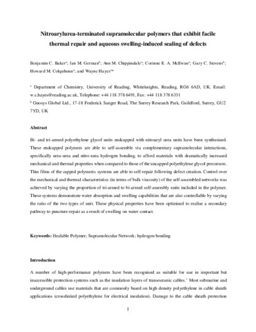 Nitroarylurea-terminated supramolecular polymers that exhibit facile thermal repair and aqueous swelling-induced sealing of defects.