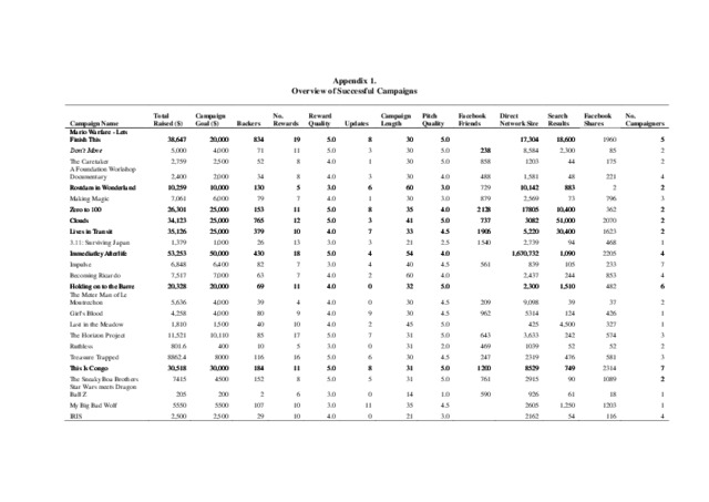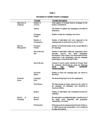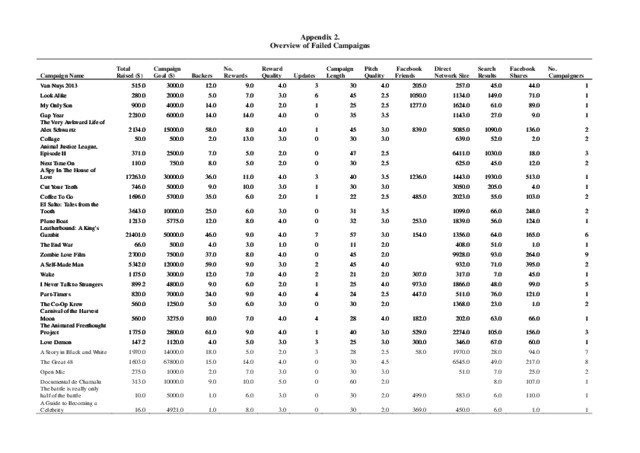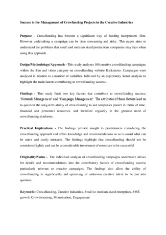 Purpose – Crowdfunding has become a significant way of funding independent film. However, undertaking a campaign can be time consuming and risky. The purpose of this paper is to understand the predictors likely to produce a film campaign that meets its funding goal. Design/methodology/approach – This study analyses 100 creative crowdfunding campaigns within the film and video category on crowdfunding website Kickstarter. Campaigns were analysed in relation to a number of variables, followed by a discriminant analysis to highlight the main predictors of crowdfunding success. Findings – This study finds key predictors of crowdfunding success and investigates differences between successful and failed crowdfunding campaigns. The attributes of these predictors lead us to question the long-term ability of crowdfunding to aid companies poorer in terms of time, financial and personnel resources, and therefore arguably in the greatest need of crowdfunding platforms. Practical implications – The findings provide insight to practitioners considering the crowdfunding approach and offers knowledge and recommendations so as to avoid what can be naïve and costly mistakes. The findings highlight that crowdfunding should not be considered lightly and can be a considerable investment of resources to be successful. Originality/value – The analysis of crowdfunding campaigns provides details on the significant predictors of crowdfunding success particularly relevant to creative campaigns. The findings provide a critique of previous claims about the benefit of crowdfunding for creative SMEs.