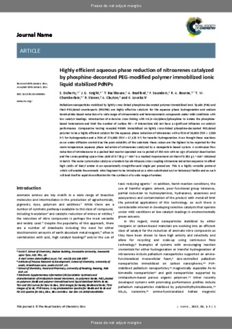 Doherty, S., Knight, J. G., Backhouse, T., Bradford, A., Saunders, F., Bourne, R. A., Chamberlain, T. W., Stones, R., Clayton, A. and Lovelock, K. orcid id iconORCID: https://orcid.org/0000-0003-1431-269X (2018) Highly efficient aqueous phase reduction of nitroarenes catalyzed by phosphine-decorated polymer immobilized ionic liquid stabilized PdNPs. Catalysis Science & Technology, 8 (5). pp. 1454-1467. ISSN 2044-4761 doi: 10.1039/c7cy02557b