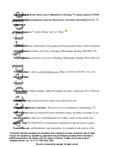Gougoulias, C., and Shaw, L.J. (2012) Evaluation of the environmental specificity of Fluorescence In Situ Hybridization (FISH) using Fluorescence-Activated Cell Sorting (FACS) of probe (PSE1284)-positive cells extracted from rhizosphere soil. Systematic and Applied Microbiology 35: 533-540.