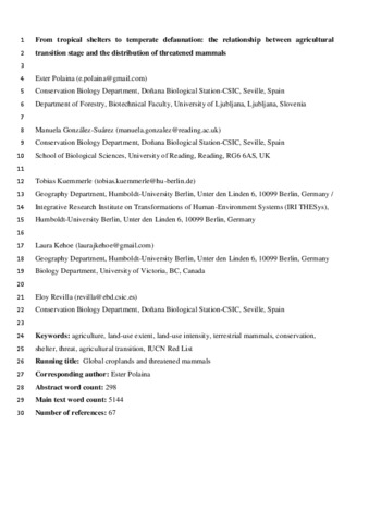 From tropical shelters to temperate defaunation: the relationship between agricultural transition stage and the distribution of threatened mammals.
