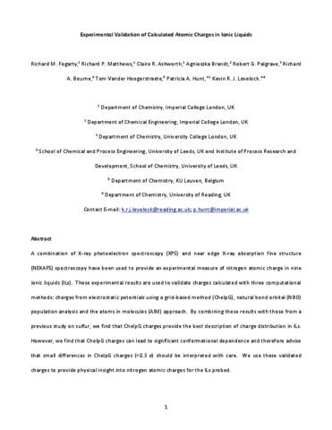 A combination of X-ray photoelectron spectroscopy (XPS) and near edge X-ray absorption fine structure (NEXAFS) spectroscopy have been used to provide an experimental measure of nitrogen atomic charge in nine ionic liquids (ILs). These experimental results are used to validate charges calculated with three computational methods: charges from electrostatic potentials using a grid-based method (ChelpG), natural bond orbital (NBO) population analysis and the atoms in molecules (AIM) approach. By combining these results with those from a previous study on sulfur, we find that ChelpG charges provide the best description of charge distribution in ILs. However, we find that ChelpG charges can lead to significant conformational dependence and therefore advise that small differences in ChelpG charges (<0.3 e) should be interpreted with care. We use these validated charges to provide physical insight into nitrogen atomic charges for the ILs probed.