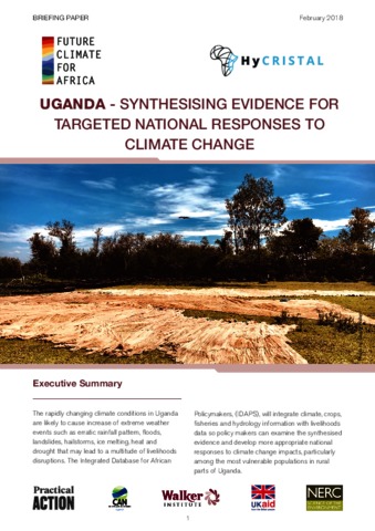 Acidri, J., Petty, E., Cornforth, R. orcid id iconORCID: https://orcid.org/0000-0003-4379-9556, Clegg, D., Ainslie, A. orcid id iconORCID: https://orcid.org/0000-0002-7549-7643, Walker, G. orcid id iconORCID: https://orcid.org/0000-0002-2176-8604, Talwisa, M. and Clenaghan, A., (2018) Uganda - Synthesising Evidence for Targeted National Responses to Climate Change. Walker Briefing Note (WIBN). 0218/01. Report. Zenodo (CERN), Switzerland. doi: 10.5281/zenodo.3510110