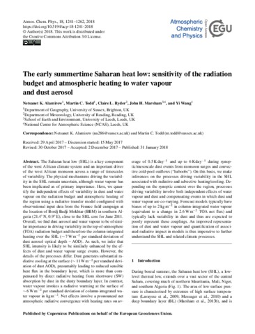 Alamirew, N. K., Todd, M. C., Ryder, C. L. orcid id iconORCID: https://orcid.org/0000-0002-9892-6113, Marsham, J. H. and Wang, Y. (2018) The early summertime Saharan heat low: sensitivity of the radiation budget and atmospheric heating to water vapour and dust aerosol. Atmospheric Chemistry and Physics, 18 (2). pp. 1241-1262. ISSN 1680-7316 doi: 10.5194/acp-18-1241-2018