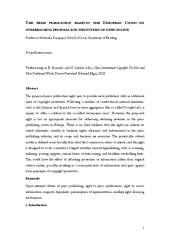 Karapapa, S. (2018) The press publishers' right in the European Union: an overreaching proposal and the future of news online. In: Bonadio, E. and Lucchi, N. (eds.) Non-Conventional Copyright: Do New and Non-traditional Works Deserve Protection? Edward Elgar, pp. 316-339. ISBN 9781786434067