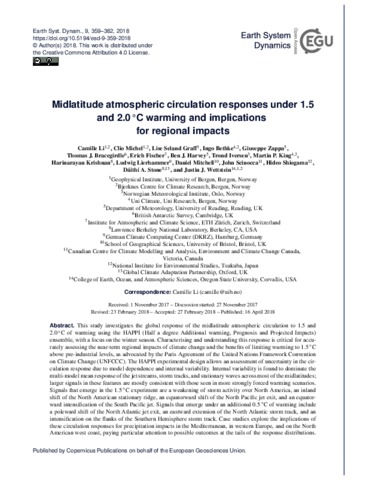 Li, C., Michel, C., Graff, L. S., Bethke, I., Zappa, G., Bracegirdle, T. J., Fischer, E., Harvey, B. orcid id iconORCID: https://orcid.org/0000-0002-6510-8181, Iversen, T., King, M. P., Krishnan, H., Lierhammer, L., Mitchell, D., Scinocca, J., Shiogama, H., Stone, D. A. and Wettstein, J. J. (2018) Midlatitude atmospheric circulation responses under 1.5C and 2.0C warming and implications for regional impacts. Earth System Dynamics, 9 (2). pp. 359-382. ISSN 2190-4987 doi: 10.5194/esd-9-359-2018
