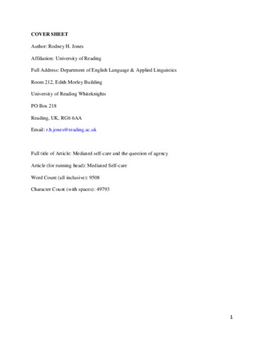 Jones, R. orcid id iconORCID: https://orcid.org/0000-0002-9426-727X (2018) Mediated self-care and the question of agency. Journal of Applied Linguistics and Professional Practice, 13 (1-3). ISSN 2040-3666 doi: 10.1558/japl.32243