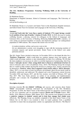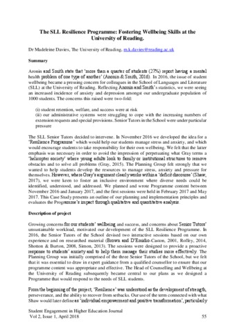 Davies, M. (2018) The SLL Resilience Programme: fostering wellbeing skills at the University of Reading. Student Engagement in Higher Education Journal, 2 (1). ISSN 2399-1836