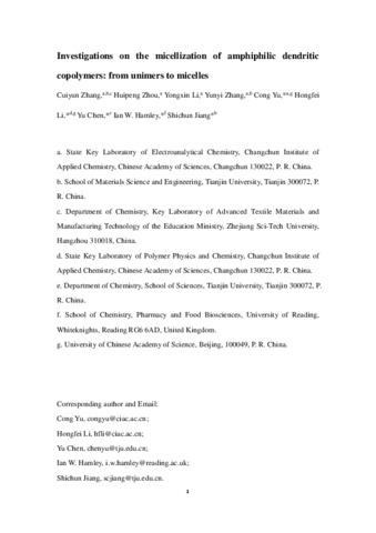 Zhang, C., Zhou, H., Li, Y., Zhang, Y., Yu, C., Li, H., Chen, Y., Hamley, I. W. orcid id iconORCID: https://orcid.org/0000-0002-4549-0926 and Jiang, S. (2018) Investigations on the micellization of amphiphilic dendritic copolymers: from unimers to micelles. Journal of Colloid and Interface Science, 514. pp. 609-614. ISSN 0021-9797 doi: 10.1016/j.jcis.2017.12.070