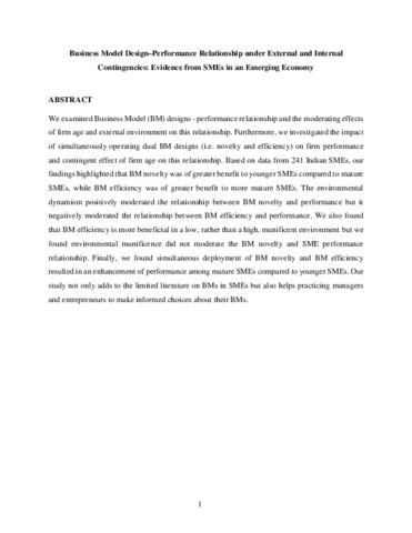 We examined Business Model (BM) designs – performance relationship and the moderating effects of firm age and external environment on this relationship. Furthermore, we investigated the impact of simultaneously operating dual BM designs (i.e. novelty and efficiency) on firm performance and contingent effect of firm age on this relationship. Based on data from 241 Indian SMEs, our findings highlighted that BM novelty was of greater benefit to younger SMEs compared to mature SMEs, while BM efficiency was of greater benefit to more mature SMEs. The environmental dynamism positively moderated the relationship between BM novelty and performance but it negatively moderated the relationship between BM efficiency and performance. We also found that BM efficiency is more beneficial in a low, rather than a high, munificent environment but we found environmental munificence did not moderate the BM novelty and SME performance relationship. Finally, we found simultaneous deployment of BM novelty and BM efficiency resulted in an enhancement of performance among mature SMEs compared to younger SMEs. Our study not only adds to the limited literature on BMs in SMEs but also helps practicing managers and entrepreneurs to make informed choices about their BMs.