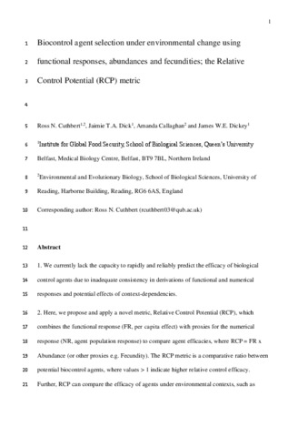 Biological control agent selection under environmental change using functional responses, abundances and fecundities; the Relative Control Potential (RCP) metric.