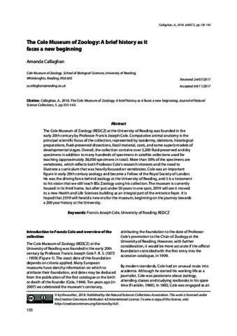 The Cole Museum of Zoology (REDCZ) at the University of Reading was founded in the early 20th century by Professor Francis Joseph Cole. Comparative animal anatomy is the principal scientific focus of the collection, represented by taxidermy, skeletons, histological preparations, fluid-preserved dissections, fossil material, casts, and some superb models of developmental stages. Overall, the collection contains over 3,200 fluid-preserved and dry specimens in addition to many hundreds of specimens in satellite collections used for teaching (approximately 38,000 specimens in total). More than 50% of the specimens are vertebrates, which reflects both Professor Cole’s research interests and the need to illustrate a curriculum that was heavily focused on vertebrates. Cole was an important figure in early 20th century zoology and became a Fellow of the Royal Society of London. He was the driving force behind zoology at the University of Reading, and it is a testament to his vision that we still teach BSc Zoology using his collection. The museum is currently housed in its third home, but after just under 50 years in one spot, 2019 will see it moved to a new Health and Life Sciences building as an integral part of the entrance foyer. It is hoped that 2019 will herald a new era for the museum, beginning on the journey towards a 200 year history at the University.