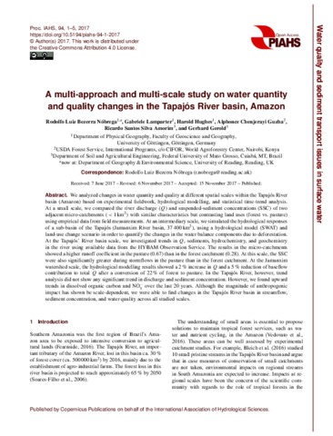 We analyzed changes in water quantity and quality at different spatial scales within the Tapajós River basin (Amazon) based on experimental fieldwork, hydrological modelling, and statistical time-trend analysis. At a small scale, we compared the river discharge (Q) and suspended-sediment concentrations (SSC) of two adjacent micro-catchments ( < 1 km2) with similar characteristics but contrasting land uses (forest vs. pasture) using empirical data from field measurements. At an intermediary scale, we simulated the hydrological responses of a sub-basin of the Tapajós (Jamanxim River basin, 37 400 km2), using a hydrological model (SWAT) and land-use change scenario in order to quantify the changes in the water balance components due to deforestation. At the Tapajós’ River basin scale, we investigated trends in Q, sediments, hydrochemistry, and geochemistry in the river using available data from the HYBAM Observation Service. The results in the micro-catchments showed a higher runoff coefficient in the pasture (0.67) than in the forest catchment (0.28). At this scale, the SSC were also significantly greater during stormflows in the pasture than in the forest catchment. At the Jamanxim watershed scale, the hydrological modelling results showed a 2 % increase in Q and a 5 % reduction of baseflow contribution to total Q after a conversion of 22 % of forest to pasture. In the Tapajós River, however, trend analysis did not show any significant trend in discharge and sediment concentration. However, we found upward trends in dissolved organic carbon and NO− 3 over the last 20 years. Although the magnitude of anthropogenic impact has shown be scale-dependent, we were able to find changes in the Tapajós River basin in streamflow, sediment concentration, and water quality across all studied scales.
