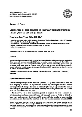 Leon-Lobos, P. and Ellis, R. orcid id iconORCID: https://orcid.org/0000-0002-3695-6894 (2018) Comparison of seed desiccation sensitivity amongst Castanea sativa, Quercus ilex and Q. cerris. Seed Science and Technology, 46. pp. 233-237. ISSN 0251-0952 doi: 10.15258/sst.2018.46.2.05