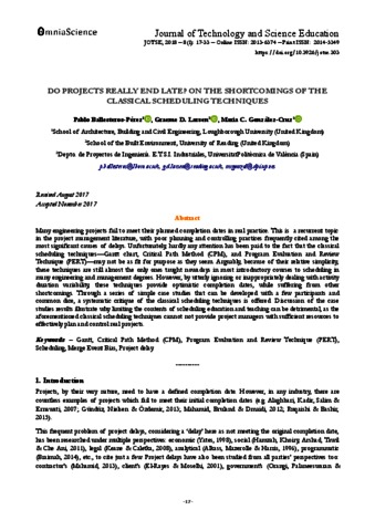 Ballesteros-Pérez, P., Larsen, G. D. and Gonzalez-Cruz, M. C. (2018) Do projects really end late? On the shortcomings of the classical scheduling techniques. Journal of Technology and Science Education, 8 (1). pp. 17-33. ISSN 2013-6374 doi: 10.3926/jotse.303