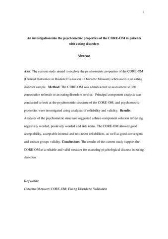 Jenkins, P. E. orcid id iconORCID: https://orcid.org/0000-0003-1673-2903 and Turner, H. M. (2014) An investigation into the psychometric properties of the CORE-OM in patients with eating disorders. Counselling and Psychotherapy Research, 14 (2). pp. 102-110. ISSN 1473-3145 doi: 10.1080/14733145.2013.782057