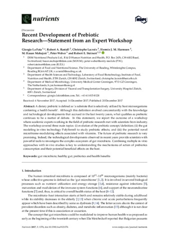 La Fata, G., Rastall, R. A., Lacroix, C., Harmsen, H., Mohajeri, M., Weber, P. and Steinert, R. (2017) Recent development of prebiotic research — statement from an expert workshop. Nutrients, 9 (12). 1376. ISSN 2072-6643 doi: 10.3390/nu9121376