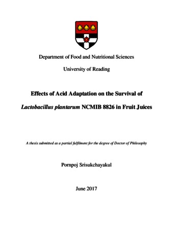 Srisukchayakul, P. (2017) Effects of acid adaptation on the survival of Lactobacillus plantarum NCMIB 8826 in fruit juices. PhD thesis, University of Reading.