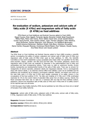 Younes, M., Aggett, P., Aguilar, F., Crebelli, R., Dusemund, B., Filipič, M., Frutos, M. J., Galtier, P., Gott, D., Gundert‐Remy, U., Kuhnle, G. G. orcid id iconORCID: https://orcid.org/0000-0002-8081-8931, Leblanc, J.‐C., Lillegaard, I. T., Moldeus, P., Mortensen, A., Oskarsson, A., Stankovic, I., Waalkens‐Berendsen, I., Woutersen, R. A., Wright, M., Boon, P., Chrysafidis, D., Gürtler, R., Mosesso, P., Parent‐Massin, D., Tobback, P., Cascio, C., Rincon, A. M. and Lambré, C., (2018) Re‐evaluation of sodium, potassium and calcium salts of fatty acids (E 470a) and magnesium salts of fatty acids (E 470b) as food additives. Report. EFSA ISSN 18314732 doi: 10.2903/j.efsa.2018.5180