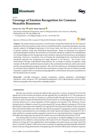 The present research proposes a novel emotion recognition framework for the computer prediction of human emotions using common wearable biosensors. Emotional perception promotes specific patterns of biological responses in the human body and this can be sensed and used to predict emotions using only biomedical measurements. Based on theoretical and empirical psychophysiological research, the foundation of autonomic specificity facilitates the establishment of a strong background for recognising human emotions using machine learning on physiological patterning. However, a systematic way of choosing the physiological data covering the elicited emotional responses for recognising the target emotions is not obvious. The current study demonstrates through experimental measurements the coverage of emotion recognition using common off-the-shelf wearable biosesnors based on the synchronisation between audiovisual stimuli and the corresponding physiological responses. The work forms the basis of validating the hypothesis for emotional state recognition in the literature, and presents coverage of the use of common wearable biosensors coupled with a novel preprocessing algorithm to demonstrate the practical prediction of the emotional states of wearers.