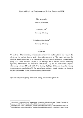 Asproudis, E., Khan, N. orcid id iconORCID: https://orcid.org/0000-0001-6911-9737 and Korac-Kakabadse, N. orcid id iconORCID: https://orcid.org/0000-0002-9517-8279 (2019) Game of regional environmental policy: Europe and US. Journal of Industry, Competition and Trade, 19 (1). pp. 1-20. ISSN 1566-1679 doi: 10.1007/s10842-018-0274-7