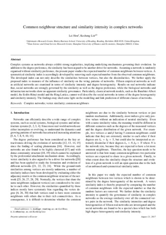 Hou, L. and Liu, K. (2017) Common neighbour structure and similarity intensity in complex networks. Physics Letters A, 381 (39). pp. 3377-3383. ISSN 0375-9601 doi: 10.1016/j.physleta.2017.08.050