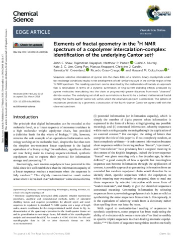 Sequence-selective intercalation of pyrene into the chain-folds of a random, binary copolyimide under fast-exchange conditions results in the development of self-similar structure in the diimide region of the 1H NMR spectrum. The resulting spectrum can be described by the mathematics of fractals, an approach that is rationalised in terms of a dynamic summation of ring-current shielding effects produced by pyrene molecules intercalating into the chain at progressively greater distances from each "observed" diimide residue. The underlying set of all such summations is found to be a defined mathematical fractal namely the fourth-quarter Cantor set, within which the observed spectrum is embedded. The pattern of resonances predicted by a geometric construction of the fourth-quarter Cantor set agrees well with the observed spectrum.