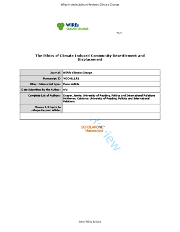 Draper, J. and McKinnon, C. (2018) The ethics of climate-induced community displacement and resettlement. WIREs Climate Change, 9 (3). e519. ISSN 1757-7799 doi: 10.1002/wcc.519