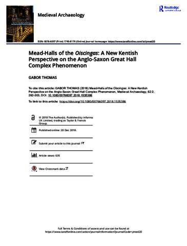Thomas, G. orcid id iconORCID: https://orcid.org/0000-0003-0311-8218 (2018) Mead-halls of the Oiscingas: a new Kentish perspective on the Anglo-Saxon great hall complex phenomenon. Medieval Archaeology, 62 (2). pp. 262-303. ISSN 0076-6097 doi: 10.1080/00766097.2018.1535386