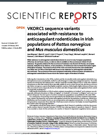 Mooney, J., Lynch, M. R., Prescott, C. V., Clegg, T., Loughlin, M., Hannon, B., Moore, C. and Faulkner, R. (2018) VKORC1 sequence variants associated with resistance to anticoagulant rodenticides in Irish populations of Rattus norvegicus and Mus musculus domesticus. Scientific Reports, 8 (1). 4535. ISSN 2045-2322 doi: 10.1038/s41598-018-22815-7