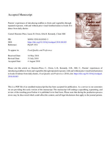 Houston-Price, C. orcid id iconORCID: https://orcid.org/0000-0001-6368-142X, Owen, L., Kennedy, O. orcid id iconORCID: https://orcid.org/0000-0003-3885-4872 and Hill, C. (2019) Parents’ experiences of introducing toddlers to fruits and vegetables through repeated exposure, with and without prior visual familiarization to foods: evidence from daily diaries. Food Quality and Preference, 71. pp. 291-300. ISSN 0950-3293 doi: 10.1016/j.foodqual.2018.08.003