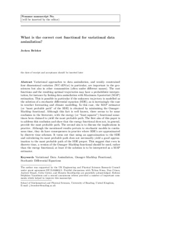 Bröcker, J. (2019) What is the correct cost functional for variational data assimilation? Climate Dynamics, 52 (1-2). pp. 389-399. ISSN 0930-7575 doi: 10.1007/s00382-018-4146-y