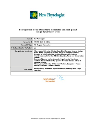 Pither, J., Pickles, B. orcid id iconORCID: https://orcid.org/0000-0002-9809-6455, Simard, S. W., Ordonez, A. and Williams, J. W. (2018) Below-ground biotic interactions moderated the postglacial range dynamics of trees. New Phytologist, 220 (4). pp. 1148-1160. ISSN 1469-8137 doi: 10.1111/nph.15203