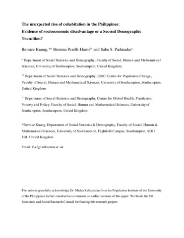 Kuang, B., Perelli-Harris, B. and Padmadas, S. (2019) The unexpected rise of cohabitation in the Philippines: evidence of socioeconomic disadvantage or a second demographic transition? Asian Population Studies, 15 (1). pp. 8-27. ISSN 1744-1749 doi: 10.1080/17441730.2018.1560664