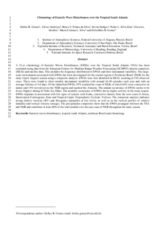 Gomes, H. B., Ambrizzi, T., Pontes da Silva, B. F., Hodges, K. orcid id iconORCID: https://orcid.org/0000-0003-0894-229X, Silva Dias, P. L., Herdies, D. L., Silva, M. C. L. and Gomes, H. B. (2019) Climatology of easterly wave disturbances over the tropical South Atlantic. Climate Dynamics, 53 (3-4). pp. 1393-1411. ISSN 0930-7575 doi: 10.1007/s00382-019-04667-7
