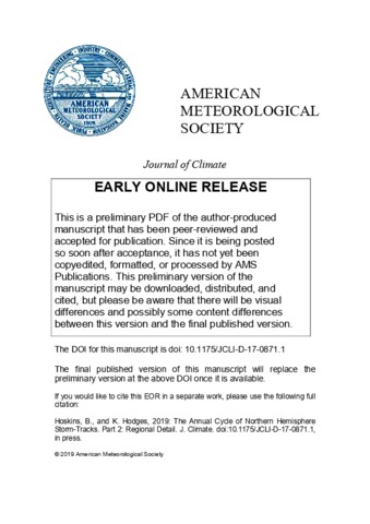 Hoskins, B. J. and Hodges, K. I. orcid id iconORCID: https://orcid.org/0000-0003-0894-229X (2019) The annual cycle of Northern Hemisphere storm-tracks. Part 2: regional detail. Journal of Climate, 32. pp. 1761-1775. ISSN 1520-0442 doi: 10.1175/jcli-d-17-0871.1