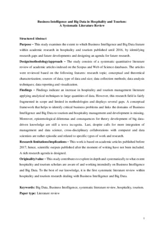 Purpose This paper aims to examine the extent to which Business Intelligence and Big Data feature within academic research in hospitality and tourism published until 2016, by identifying research gaps and future developments and designing an agenda for future research. Design/methodology/approach The study consists of a systematic quantitative literature review of academic articles indexed on the Scopus and Web of Science databases. The articles were reviewed based on the following features: research topic; conceptual and theoretical characterization; sources of data; type of data and size; data collection methods; data analysis techniques; and data reporting and visualization. Findings Findings indicate an increase in hospitality and tourism management literature applying analytical techniques to large quantities of data. However, this research field is fairly fragmented in scope and limited in methodologies and displays several gaps. A conceptual framework that helps to identify critical business problems and links the domains of business intelligence and big data to tourism and hospitality management and development is missing. Moreover, epistemological dilemmas and consequences for theory development of big data-driven knowledge are still a terra incognita. Last, despite calls for more integration of management and data science, cross-disciplinary collaborations with computer and data scientists are rather episodic and related to specific types of work and research. Research limitations/implications This work is based on academic articles published before 2017; hence, scientific outputs published after the moment of writing have not been included. A rich research agenda is designed. Originality/value This study contributes to explore in depth and systematically to what extent hospitality and tourism scholars are aware of and working intendedly on business intelligence and big data. To the best of the authors’ knowledge, it is the first systematic literature review within hospitality and tourism research dealing with business intelligence and big data.