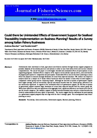 Governments have intervened in food, agricultural and fisheries markets through various support programs to promote adoption of traceability practices and systems in order to raise food safety levels and increase industry competitiveness. The aim of this paper is to investigate intended and unintended effects of participation in such supporting programs. Intended effects comprise of the impacts on traceability capacity levels, costs and benefits of program participants vs. comparable non-participants. Unintended effects concern the firms’ planning accuracy which we propose to measure through deviations of actual from expected outcomes. We conduct our empirical analysis based on a sample of 55 Italian fishery businesses which we divide in firms who received support, a comparable control group and the remaining sample. Although we find that recipients of government support have higher average levels of traceability capacity and overall benefits than the control group, differences are not statistically significant. In regards to the unintended effects of government support, we find that recipients of government support reported larger deviations of actual from expected benefits than the control group did. While these differences were not significant at the aggregate level, significant differences are found at the level of specific benefit categories. For example, support recipients had overestimated sales and price related benefits but severely underestimated efficiency gains in operations. The results suggest that the motivation for participating in a government support program may not align with the firm’s strategic goals. This misalignment may reduce planning accuracy.