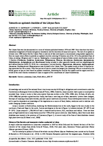The Libyan flora was last documented in a series of volumes published between 1976 and 1989. Since then there has been a substantial realignment of family and generic boundaries and the discovery of many new species. The lack of an update or revision since 1989 means that the Libyan Flora is now out of date and requires a reassessment using modern approaches. Here we report initial efforts to provide an updated checklist covering 43 families out of the 150 in the published flora of Libya, including 138 genera and 411 species. Updating the circumscription of taxa to follow current classification results in 11 families (Coridaceae, Guttiferae, Leonticaceae, Theligonaceae, Tiliaceae, Sterculiaceae, Bombacaeae, Sparganiaceae, Globulariaceae, Asclepiadaceae and Illecebraceae) being included in other generally broader and less morphologically well-defined families (APG-IV, 2016). As a consequence, six new families: Hypericaceae, Adoxaceae, Lophiocarpaceae, Limeaceae, Gisekiaceae and Cleomaceae are now included in the Libyan Flora. This update results in those 43 families being represented by 38 accounts. Fifty-five percent of species remain unchanged, the remaining 45% are reclassified at the family, genus or species level based on modern treatments, illustrating the need for this update and the urgent need for a review of the entire floristic treatment of Libya in support of the conservation of Libya’s biodiversity.