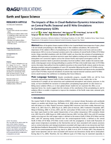 Li, J.-L. F., Suhas, E., Richardson, M., Lee, W.-L., Wang, Y.-H., Yu, J.-Y., Lee, T., Fetzer, E., Stephens, G. and Shen, M.-H. (2018) The impacts of bias in cloud-radiation-dynamics interactions on central Pacific seasonal and El Niño simulations in contemporary GCMs. Earth and Space Science, 5 (2). pp. 50-60. ISSN 2333-5084 doi: 10.1002/2017EA000304