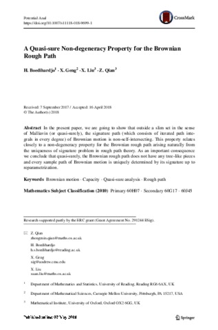 Boedihardjo, H., Geng, X., Liu, X. and Qian, Z. (2019) A quasi-sure non-degeneracy property for the Brownian rough path. Potential Analysis, 51 (1). pp. 1-21. ISSN 0926-2601 doi: 10.1007/s11118-018-9699-1