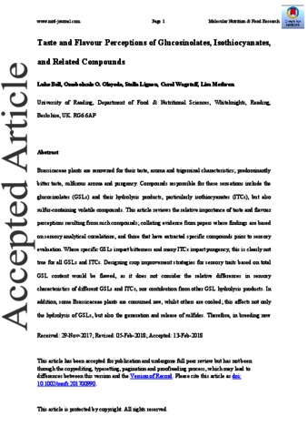 Bell, L. orcid id iconORCID: https://orcid.org/0000-0003-2895-2030, Oloyede, O. O., Lignou, S. orcid id iconORCID: https://orcid.org/0000-0001-6971-2258, Wagstaff, C. orcid id iconORCID: https://orcid.org/0000-0001-9400-8641 and Methven, L. (2018) Taste and flavour perceptions of glucosinolates, isothiocyanates, and related compounds. Molecular Nutrition & Food Research, 62 (18). 1700990. ISSN ‎1613-4125 doi: 10.1002/mnfr.201700990