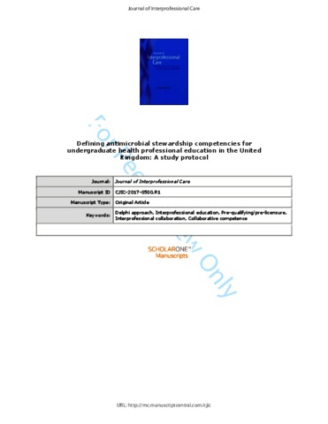 Courtenay, M., Castro-Sanchez, E., Deslandes, R., Hodson, K., Lim, R. orcid id iconORCID: https://orcid.org/0000-0003-1705-1480, Morris, G., Reeves, S. and Weiss, M. (2018) Defining antimicrobial stewardship competencies for undergraduate health professional education in the United Kingdom: a study protocol. Journal of Interprofessional Care, 32 (5). pp. 638-640. ISSN 1469-9567 doi: 10.1080/13561820.2018.1463200
