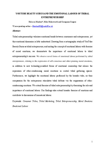 Mardon, R., Molesworth, M. and Grigore, G. (2018) YouTube beauty gurus and the emotional labour of tribal entrepreneurship. Journal of Business Research, 92. pp. 443-454. ISSN 0148-2963 doi: 10.1016/j.jbusres.2018.04.017